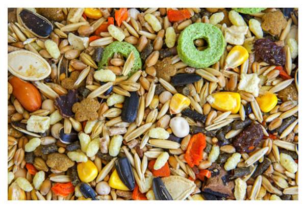 - Состав корма Пшеница, овёс, ячмень, травяная гранула, комбикорм, горох, кукуруза, морковь, арахис, рожковое дерево, просо желтое, подсолнечник полосатый, изюм, шиповник(или рябина), подсолнечник черный, семя тыквы, семя льняное, суданка, яблоко, кукуруза экструдированная, банан.