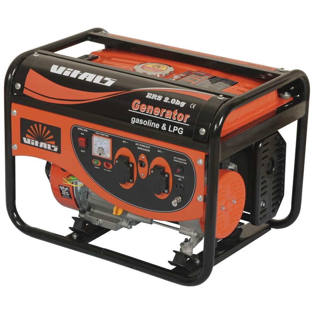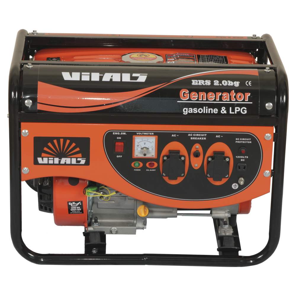 Латвийского производства комбинированный генератор Vitals ERS 2.0bg с одной фазой работает на двух видах топлива – бензиновом и газовом. Комбинирование топливной системы двигателя расширяет возможности эксплуатации генераторной установки и при использовании сжиженного газа в качестве горючего значительно удешевляют потребление. Разработанный производителем бензиново-газовый генератор Vitals ERS2.0bg сам по себе обладает пониженным потреблением топлива благодаря установленной системе с экономией расхода горючего. Вместительность бака емкостью 15 литров совместно с системой экономного потребления обеспечивает работоспособность установки без дозаправки на 12 час непрерывной работы. Бензин можно заливать 92й и 95й, а для заправки газом подойдет LPG с входным давлением 0,4 МПа.