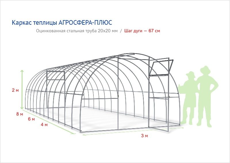 Дополнительная информацияВ комплекте все необходимые для сборки болты и саморезы, а также Т-образные ножки. Теплица Агросфера-Плюс Разборная подходит как для установки её в грунт, так и для установки на любой вид фундамента. Каркас теплицы Агросфера-Плюс Разборная упакован в картонную упаковку, что позволяет перевозить теплицу на багажнике легкового автомобиля.