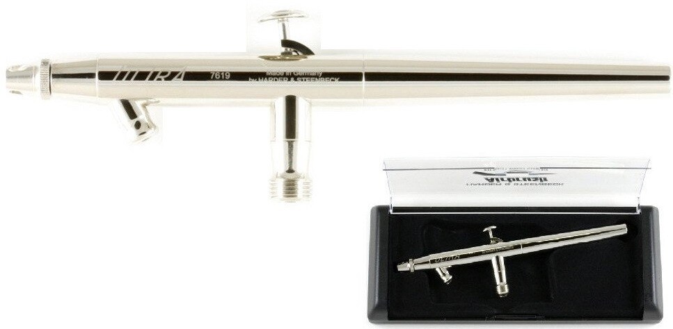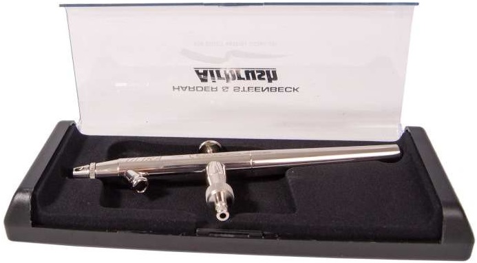 Лучший аэрограф, который может справиться с заданиями любой сложности, – Harder&Steenbeck с конусным соплом 0,4 мм. Он считается одним из лучших вариантов для начинающих, но для профессиональных художников, моделистов, ретушеров, визажистов, боди-арта и кондитерского оформления устройство тоже отлично подходит. Его используют для покраски разных поверхностей: металла, дерева, кожи, стекла и т.д. При этом потеки краски не возникают за счет мелкодисперсного распыления. Качественное и аккуратное покрытие гарантировано.