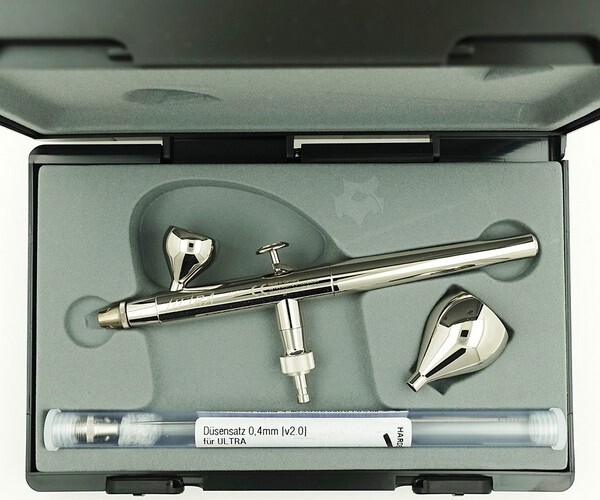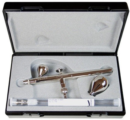 Если вы начинающий художник или моделист и не знаете, на каком аэрографе остановиться, тогда отдайте предпочтение Harder&Steenbeck с соплами разного диаметра – 0,2 мм и 0,4 мм. Благодаря большему можно быстро закрашивать общий фон и более крупные детали, а меньший идеально подходит для детализации. Стать профессионалом с таким высококачественным инструментом очень просто. Он подходит для разных поверхностей – холсты, ткань, дерево, пластик, металл, кожа. При этом потеки не образовываются за счет мелкодисперсного распыления.