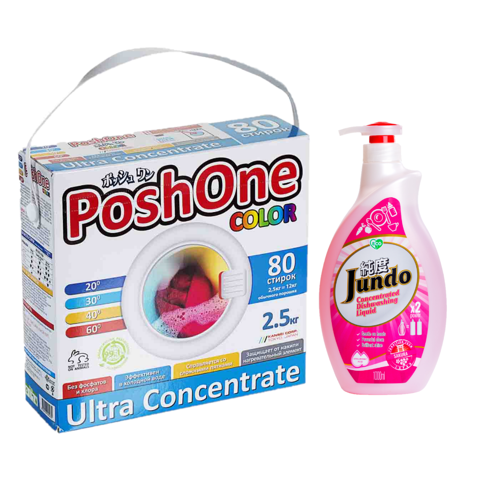 - Состав набора 1. Стиральный порошок для цветного белья Posh One 2.5 кг; 2. ЭКО концентрат для мытья посуды JUNDO Sakura 1 л.