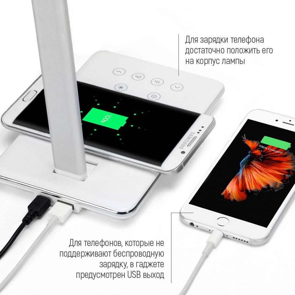 Сенсорні кнопки на корпусі забезпечать безшумне і м'яке управління девайсом. Для зарядки телефону досить покласти його на корпус лампи, якщо ж телефон не підтримує бездротову зарядку, то в гаджеті передбачений USB вихід. Лампа має функцію нічника з таймером автоматичного відключення.