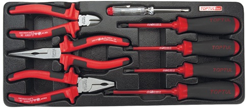 • Комплектация - бокорезы 6" 1000V; - плоскогубцы 7" 1000V; - плоскогубцы с удлиненными губками 8" 1000V; - отвертка шлицевая 4.0х100 мм изолированная (1000V); - отвертка шлицевая 5.5х125 мм изолированная (1000V); - отвертка крестовая PH1х100 мм изолированная (1000V); - ключ накидной (угол 75°) 12х13 мм; - отвертка-индикатор напряжения; - ложемент