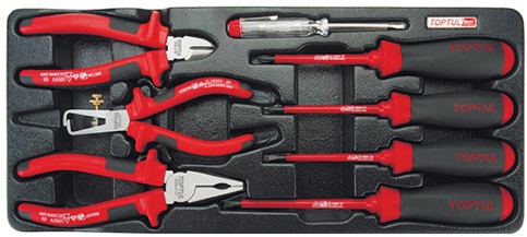 • Комплектация - Плоскогубцы 7" 1000V; - бокорезы 6" 1000V; - клещи для снятия изоляции 6" 1000V; - отвертка крестовая PH1х100 мм изолированная (1000V); - отвертка крестовая PH2х100 мм изолированная (1000V); - отвертка шлицевая 4.0х100 мм изолированная (1000V); - отвертка шлицевая 5.5х125 мм изолированная (1000V); - отвертка-индикатор напряжения; - ложемент