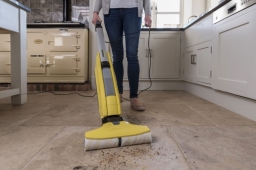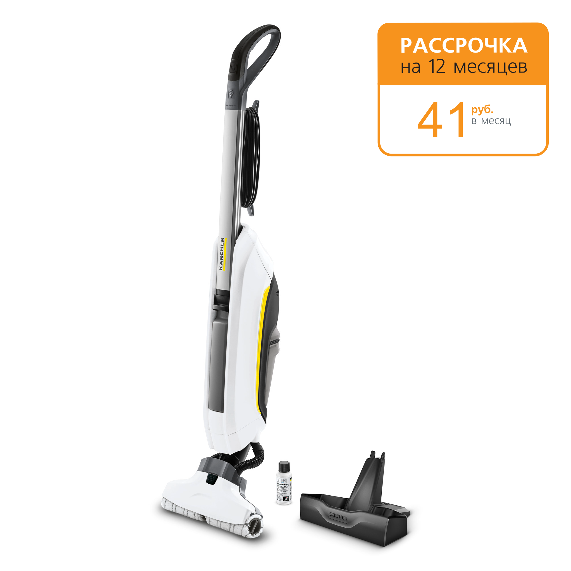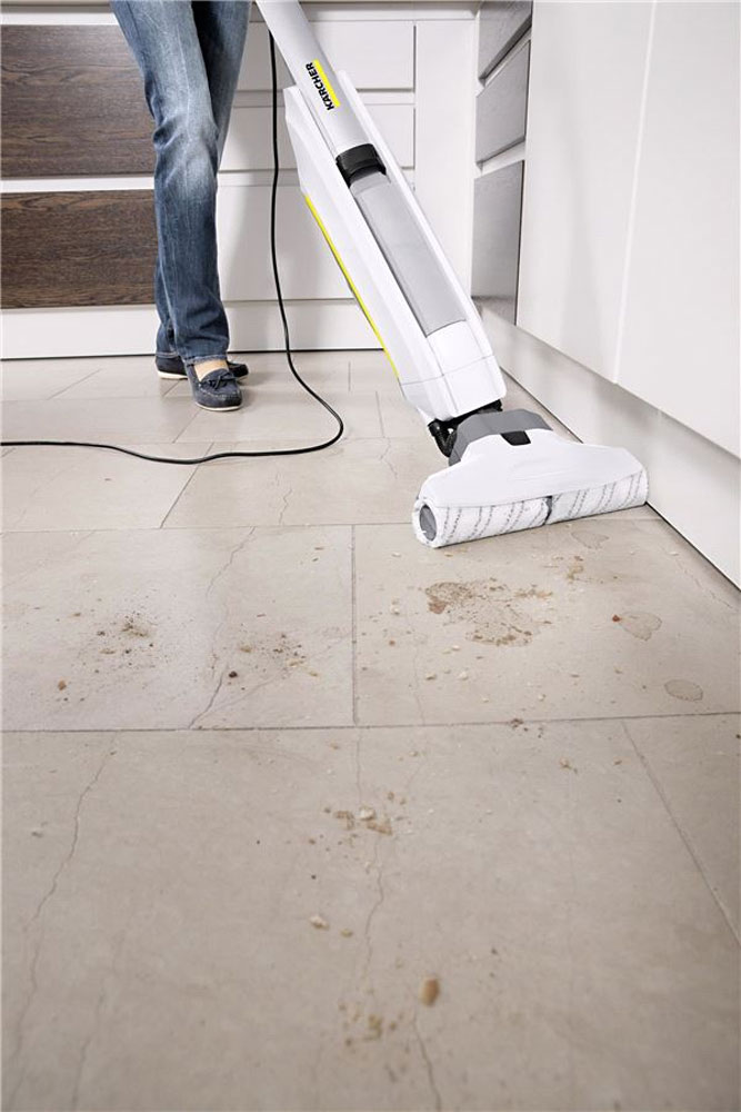 Karcher FC 5 оборудован 2 прочными щетками из микроволокна, которые можно стирать в машинке. Скорость вращения – 500 оборотов в минуту. Грязная вода всасывается непрерывно, за счет чего пол высыхает менее, чем за 2 минуты. Длинный 7-метровый шнур позволяет передвигаться беспрепятственно в любые уголки квартиры. Вес пылесоса – 5 кг.