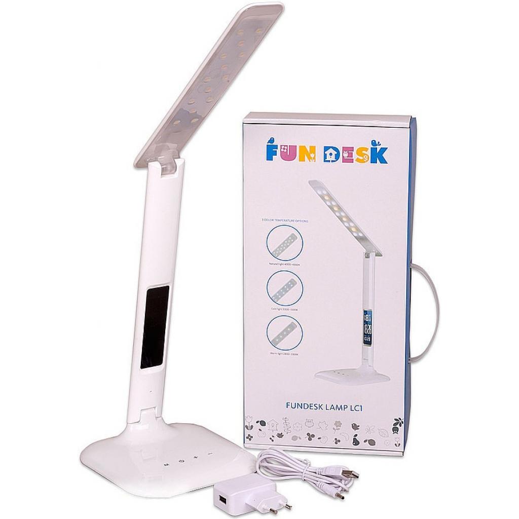 Настільна світлодіодна лампа FunDesk LC1 має можливість зміни температури світлового потоку і регулюванням яскравості світіння. Високоякісні світлодіоди забезпечують приємний і безпечний світловий потік. Сенсорні органи управління, винесені на підставку, роблять використання світильника максимально зручним.