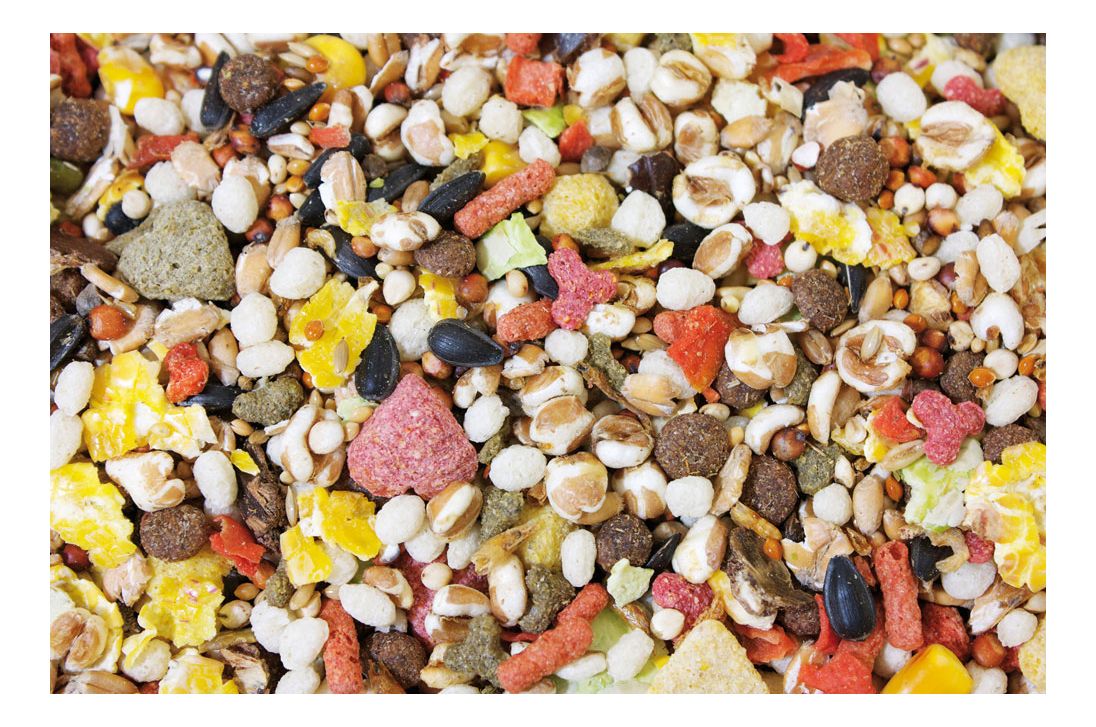 - Состав корма Экструдированная кукурузная мука, хлопья кукурузы, сорго двуцветное, пшеница, хлопья пшеницы, сорго обыкновенное, семена подсолнечника 5%, воздушная пшеница, хлопья гороха, кукуруза, рожковое дерево, желтое просо, морковь, канареечное семя, гречиха, красное просо, бобовые, мясо домашней птицы 1,2%, говядина 1,2%, мята, овсяные снэки, креветки 1%, рыба 0,6%, сыр 0,2%.