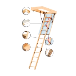 ОПИСАНИЕ ПРОДУКТА - С обеих сторон белая изоляционная крышка типа „сэндвич”, толщиной 26 мм - Деревянная лестница 4-секционная. - Отличная герметичность между крышкой лестницы и рамой, благодаря специальной прокладке, установленной в коробке - Ступени лестницы соединяются с лестницей на „ласточкин хвост” - Антискользящий профиль - Встроенный замок – отсутствие выступающих элементов из люка - Коробка с уплотнителем, высотой 13 см - Максимальная нагрузка 150 кг - Лестница полностью собрана для быстрой установки - Продукт соответствует стандарту EN 14975:2007 - Сертификат TÜV - Длина лестницы 280 см, рассчитана на высоту 270 см - Габариты ступеней 33х7,5х2 см Инструкция монтажа чердачной лестницы [ /upload/IMG/instrukcii/instrukcja_schody_drewniane.pdf ]