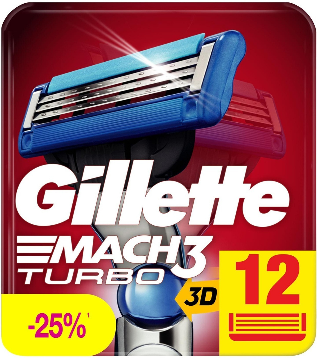 Сменные кассеты лезвия Gillette Mach3 Turbo Насадки Джилет с 3 лезвиями и долговечной гелевой полоской 12 шт