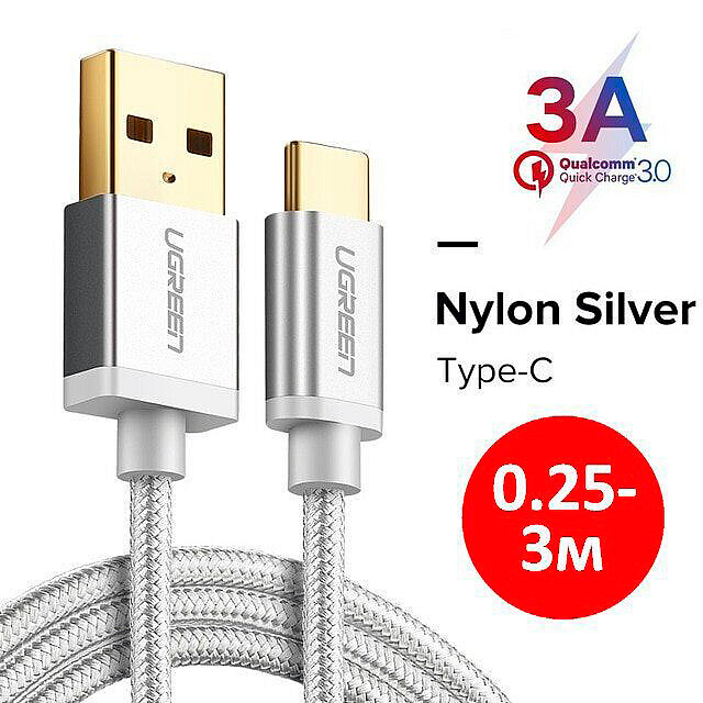 Кабель Ugreen USB Type-C 3А (USB 2.0, серебристый, 0.25M)