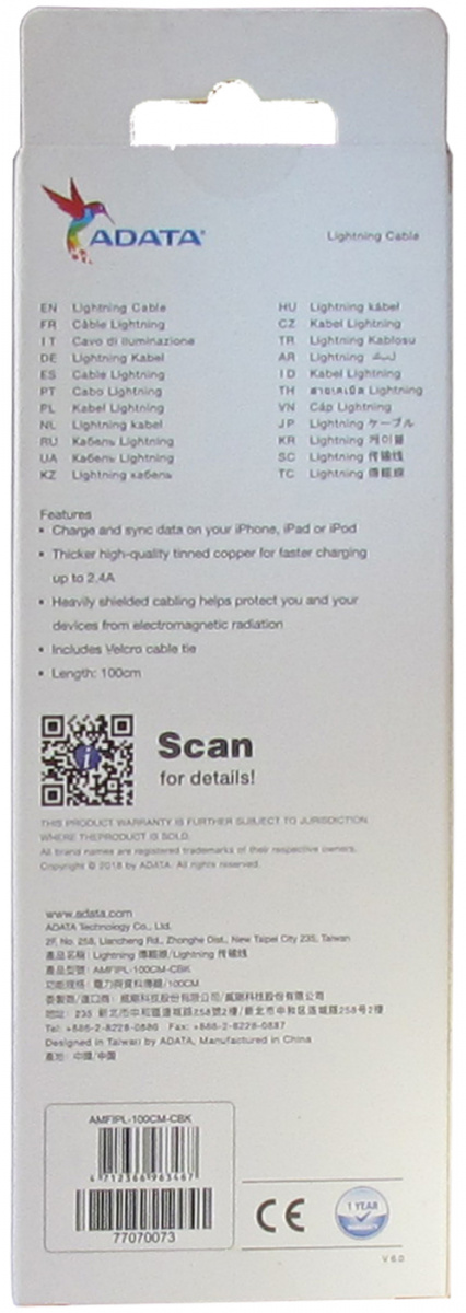 Кабель Apple Lightning - USB ADATA AMFIPL-100CM-CBK, цвет: черный