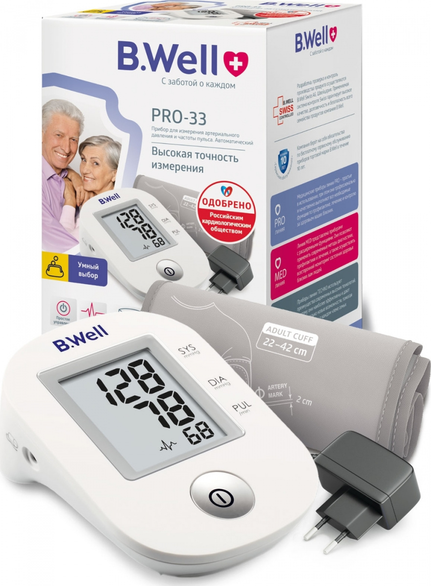Тонометр B.Well PRO-33 (M-L) манжета (22-42 см), адаптер, индикатор аритмии