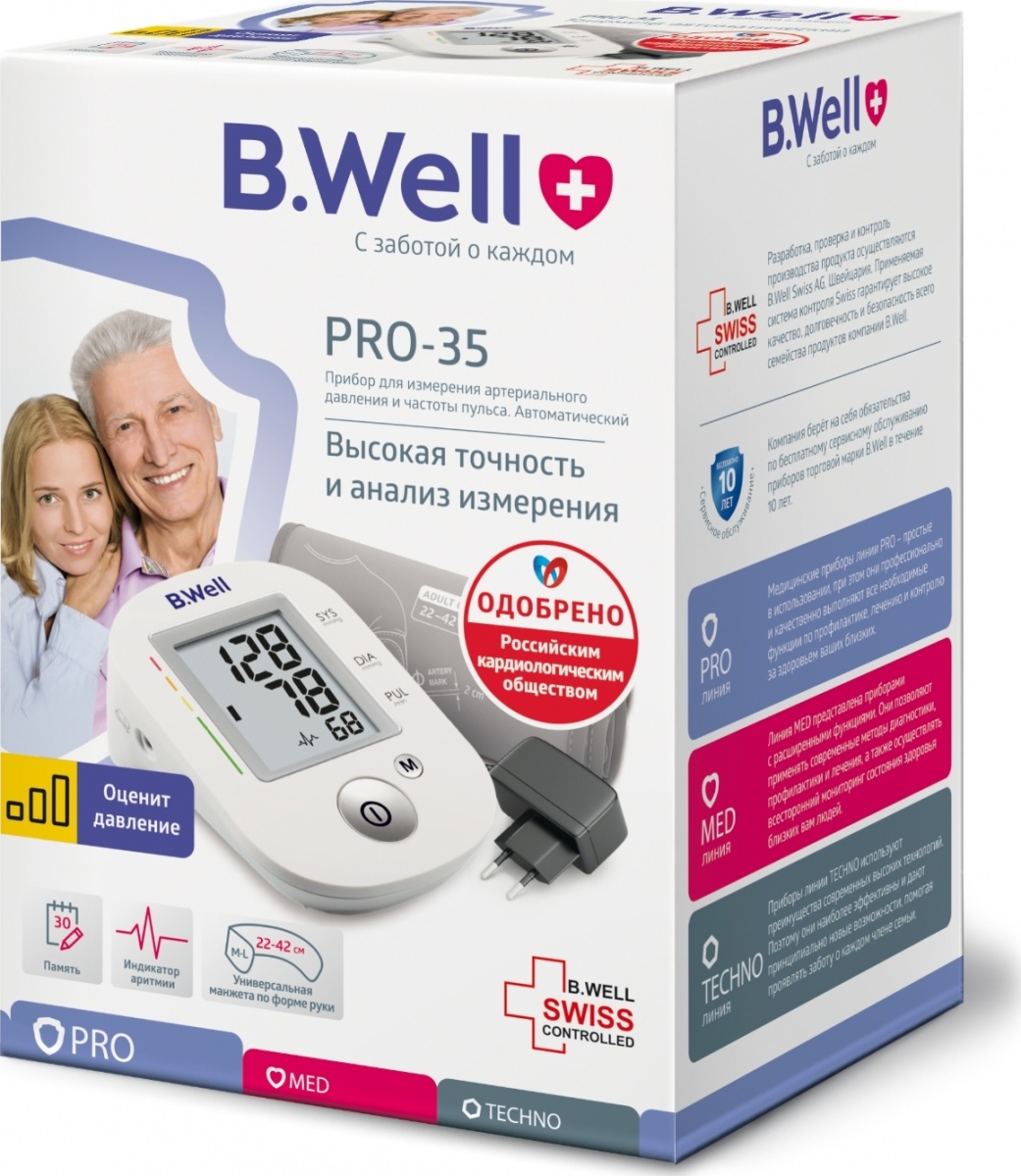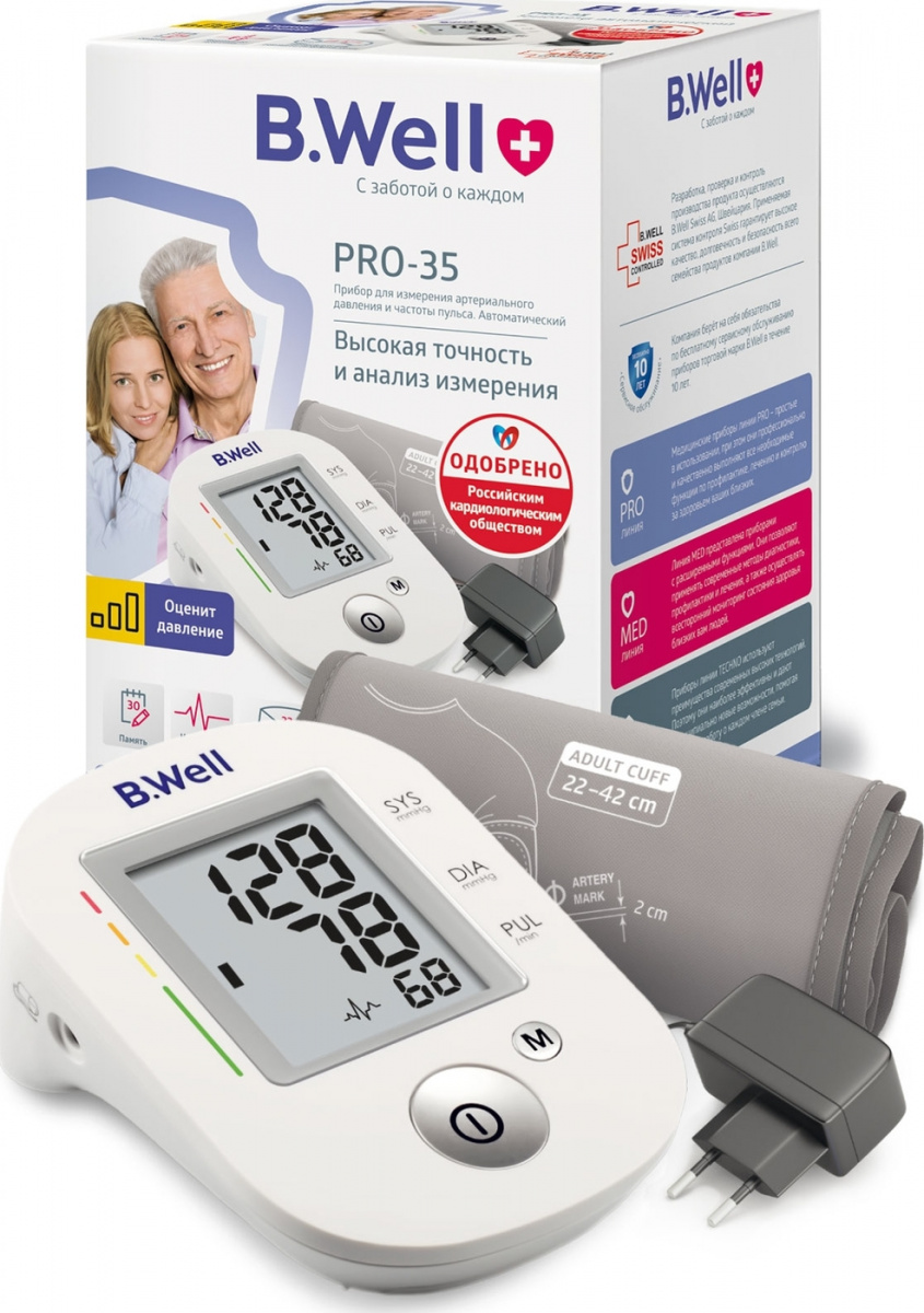 Комплектация:Тонометр, манжета конусная на плечо размера М-L для обхвата плеча 22-42 см, сетевой адаптер, батарейки типа ААА (4 шт), гарантийный талон, инструкция, сумка для хранения