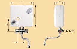 Водонагреватель проточный, электрический нагрев, мощность 4.4 кВт, производительность 2.1 л/мин, вертикальная установка, подводка нижняя, смеситель.