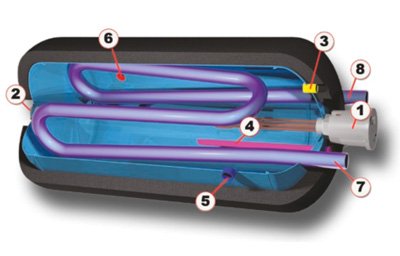 Водонагреватель накопительный, косвенный нагрев, объем 120 л, мощность 6.8 кВт, производительность 10 л/мин, горизонтальная установка.