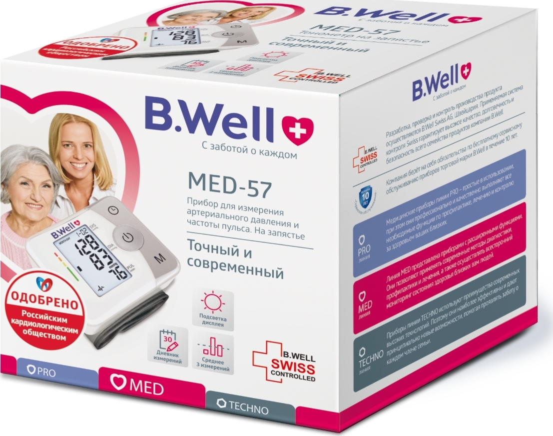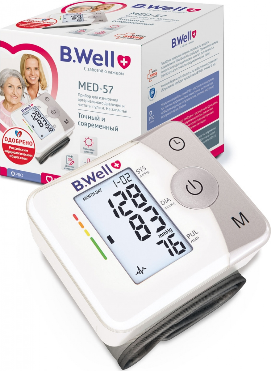 Тонометр B.Well MED-57 на запястье, подсветка дисплея, дневник измерений, индикатором аритмии, шкала давления