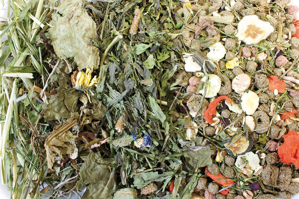 - Состав корма Экструдированная кукурузная мука,растительные волокна, зеленый овес 6,7%, петрушка, хлопья гороха, морковь 4,2%, хлопья пшеницы, подорожник, одуванчик 3,3%, хлопья бобовых, семена трав 2,6%, мелисса 2,6%, пастернак 2,5%, воздушная пшеница, кукурузные хлопья, овсяные хлопья, свекла, перечная мята 1%, овес, юкка 0,4%, любисток, тимьян, перец, цуккини, огурцы, льняные семена 0,17%, фенхель, семена черного тмина