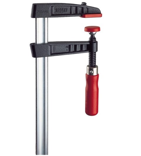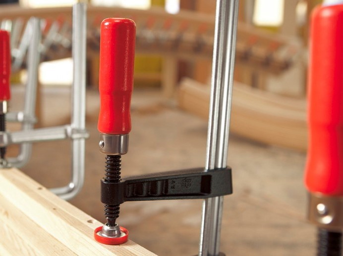 Чугунная столярная струбцина F-подобной конструкции со стальным профилем и винтовым механизмом сжатия. Предназначена для больших зажимных усилий и длинных деталей. Оснащена встроенной защитой от проскальзывания.