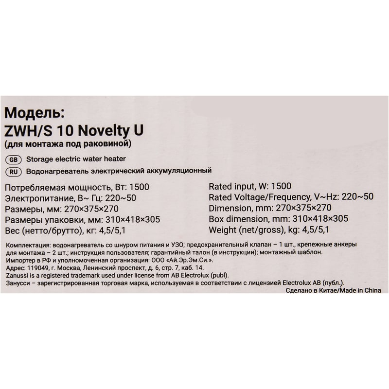 Электроводонагреватель накопительный Zanussi ZWH/S 10 Novelty U вертикальный, 10 л, нержавеющая сталь