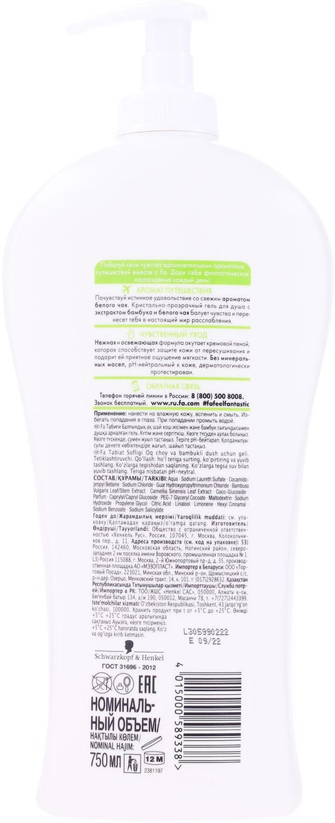 FA Гель для душа женский Природная Свежесть Белый Чай и Бамбук, 750 мл