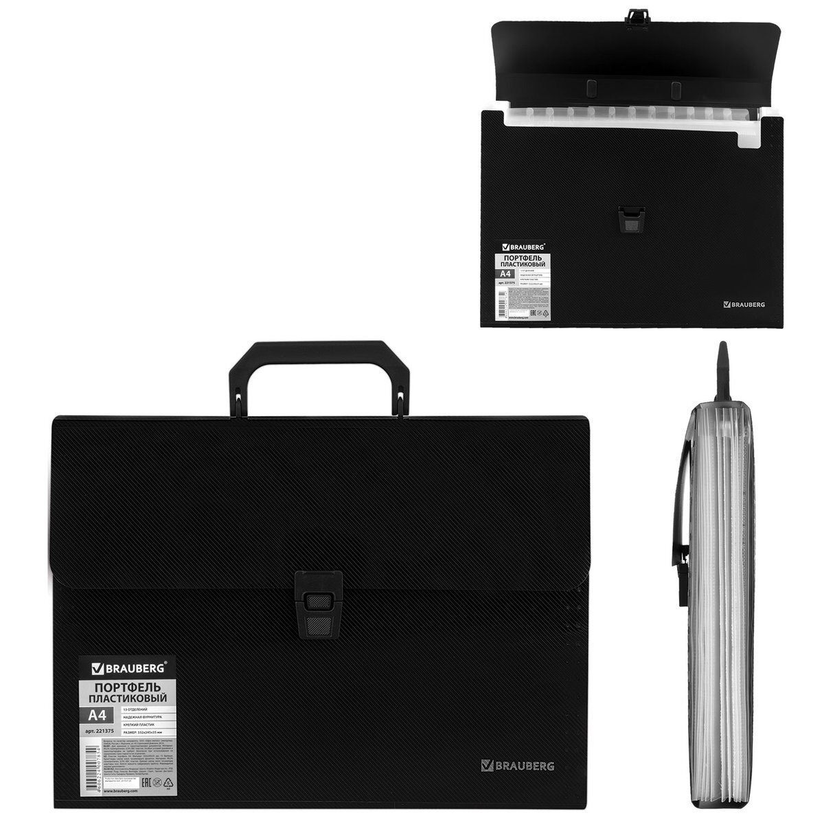 Портфель пластиковый Brauberg А4 (332х245х35 мм), 13 отделений, индексные ярлыки, фактура диагональ, черный, 221375