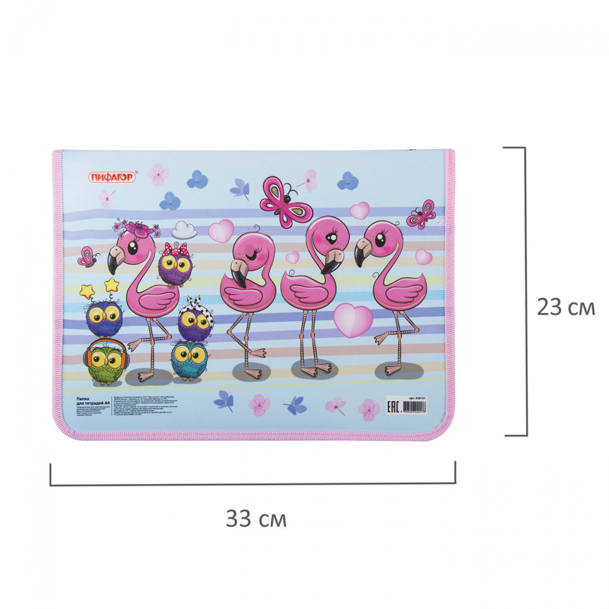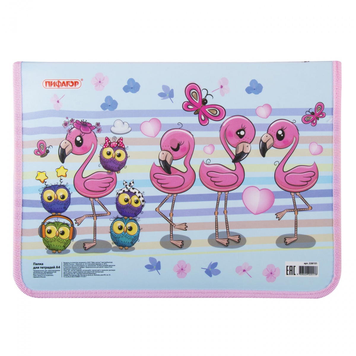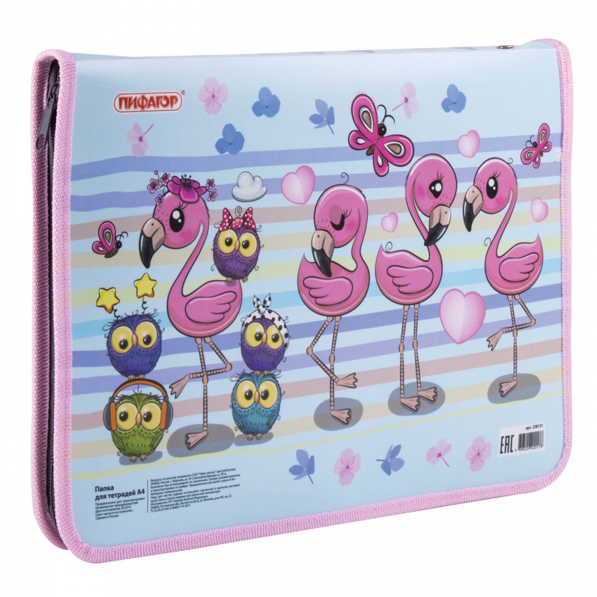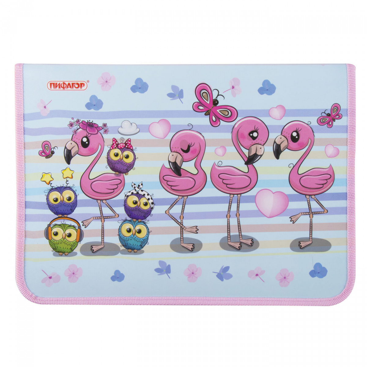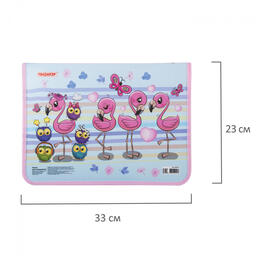 Папка для тетрадей Пифагор, А4, 1 отделение, пластик, цветная печать, молния вокруг, "Фламинго", 228151