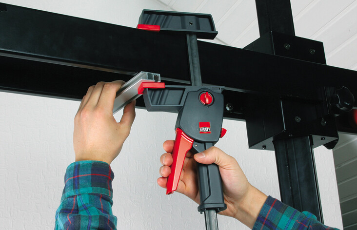 Bessey DUO45-8 - качественное зажимное устройство, которое используется для обработки деревянных или металлических заготовок. Изделие выполнено из прочного металла, обладает сильным прижимным действием и гарантирует возможность работы с ним при помощи только одной руки.
