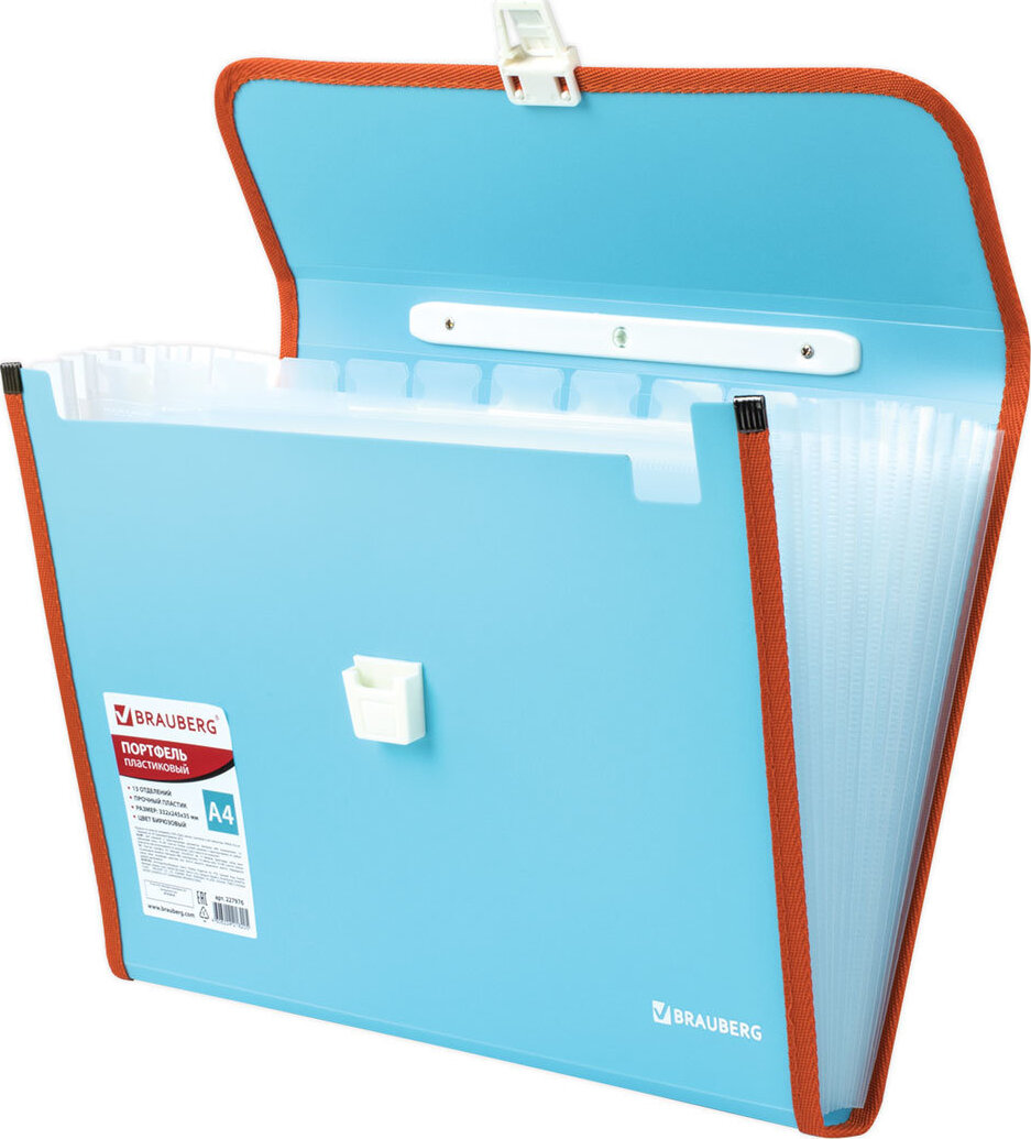 Портфель пластиковый Brauberg "Joy", А4 (330х245х35 мм), 13 отделений, с окантовкой, индексные ярлыки, бирюзовый, 227976