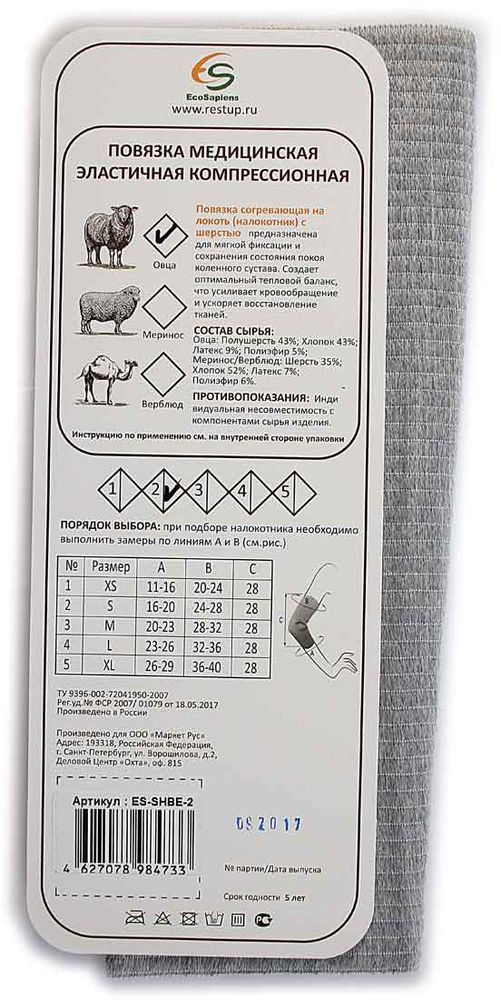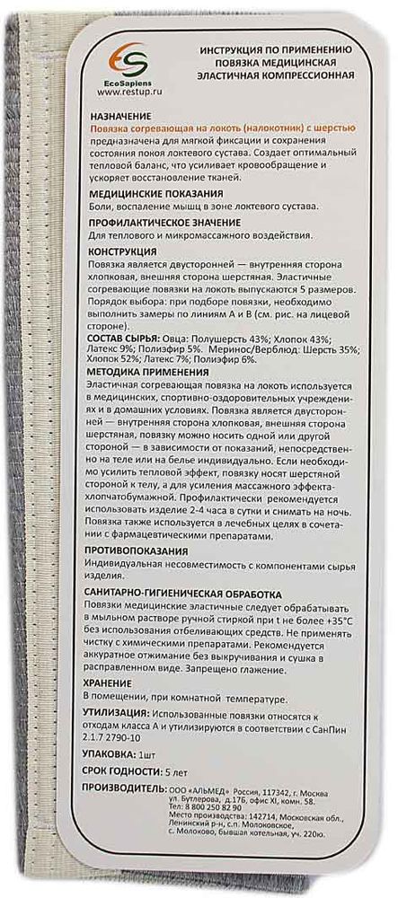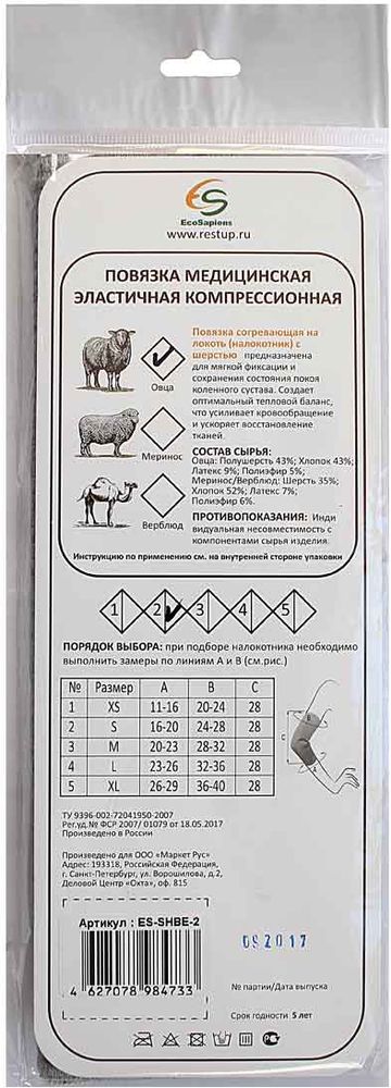 EcoSapiens Налокотник согревающий фиксирующая повязка с шерстью овцы, размер 2 (S)