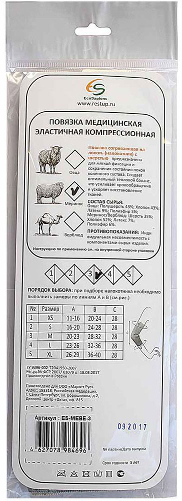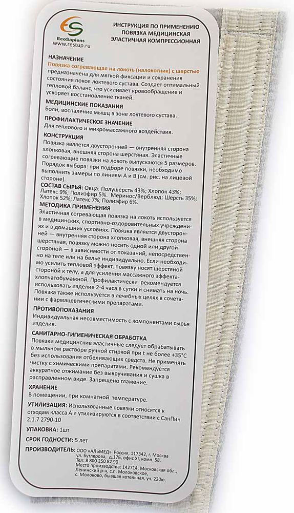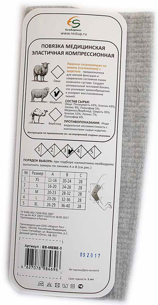 EcoSapiens Налокотник согревающий фиксирующая повязка с шерстью мериноса, размер 3 (M)