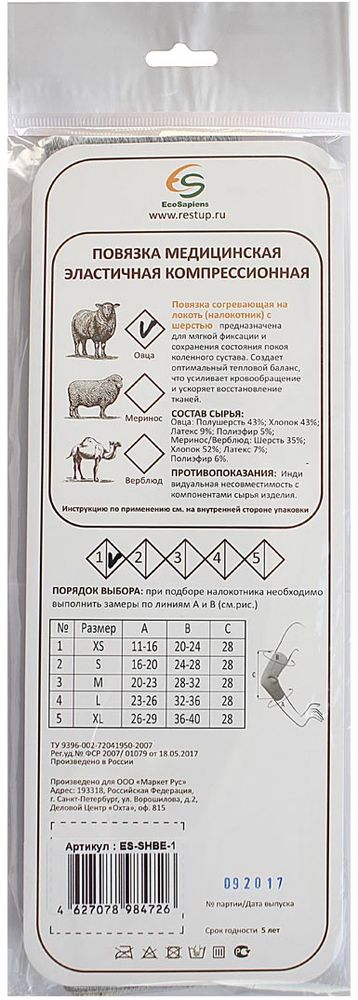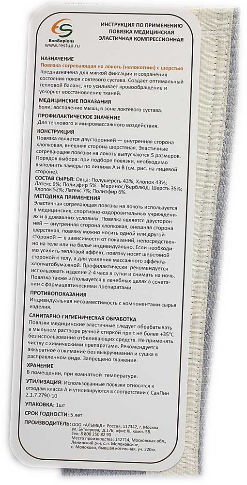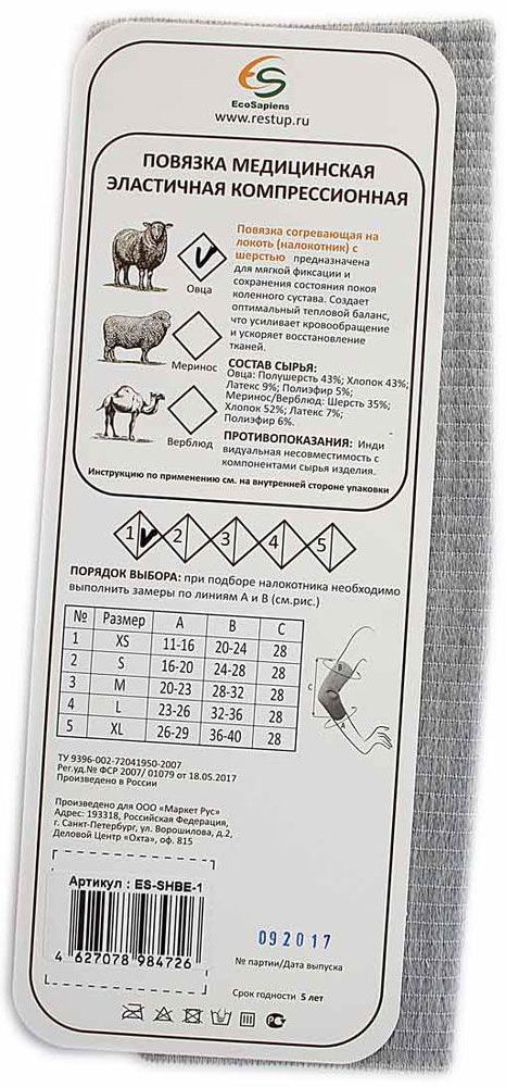 EcoSapiens Налокотник согревающий фиксирующая повязка с шерстью овцы, размер 1 (XS)