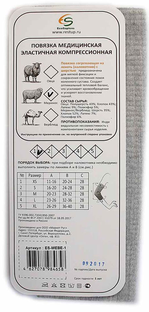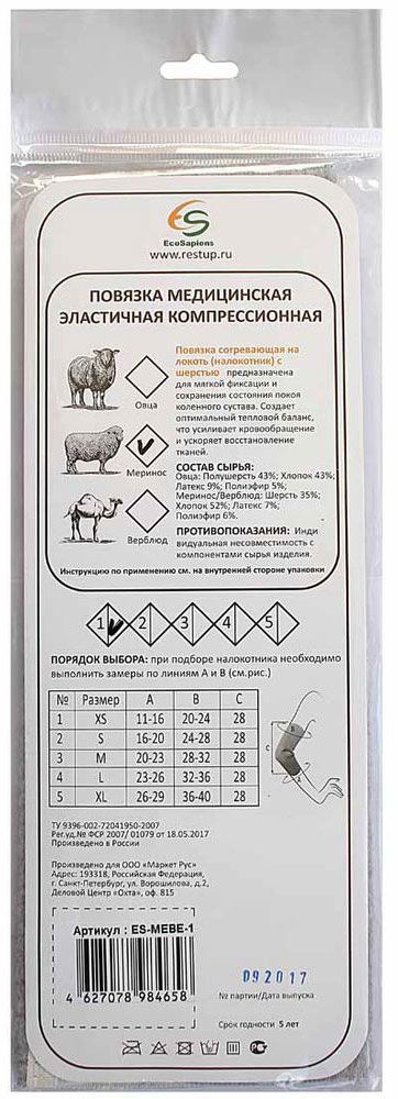 EcoSapiens Налокотник согревающий фиксирующая повязка с шерстью мериноса, размер 1 (XS)