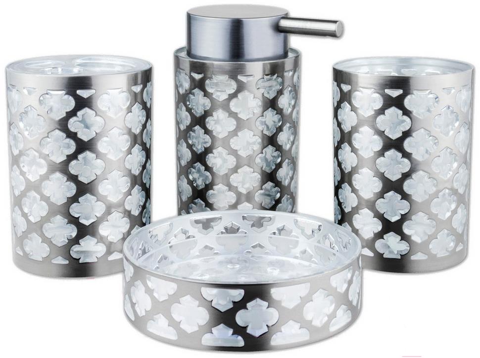 - Комплектация дозатор жидкого мыла, мыльница, стакан для зубных щеток, стакан косметический