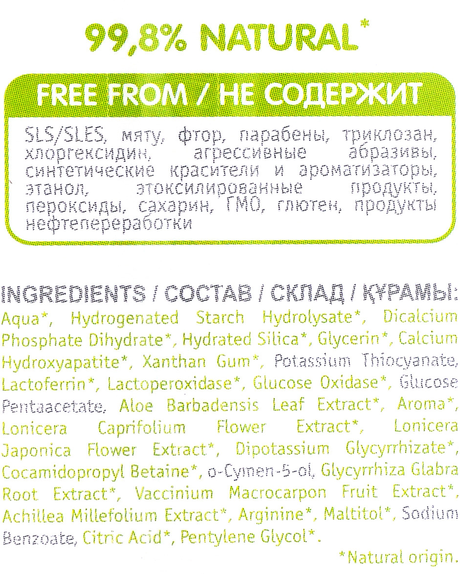 - Состав: Состав зубной пасты: Aqua*, Hydrogenated Starch Hydrolysate*, Dicalcium Phosphate Dihydrate*, Hydrated Silica*, Glycerin*, Calcium Hydroxyapatite*, Xanthan Gum*, Potassium Thiocyanate, Lactoferrin*, Lactoperoxidase*, Glucose Oxidase*, Glucose Pentaacetate, Aloe Barbadensis Leaf Extract*, Aroma*, Lonicera Caprifolium Flower Extract*, Lonicera Japonica Flower Extract*, Dipotassium Glycyrrhizate*, Cocamidopropyl Betaine*, o-Cymen-5-ol, Glycyrrhiza Glabra Root Extract*, Vaccinium Macrocarpon Fruit Extract*, Achillea Millefolium Extract*, Arginine*, Maltitol*, Sodium Benzoate, Citric Acid*, Pentylene Glycol*. Материал щетки – пищевой силикон. Мягкая щетина. *Natural origin