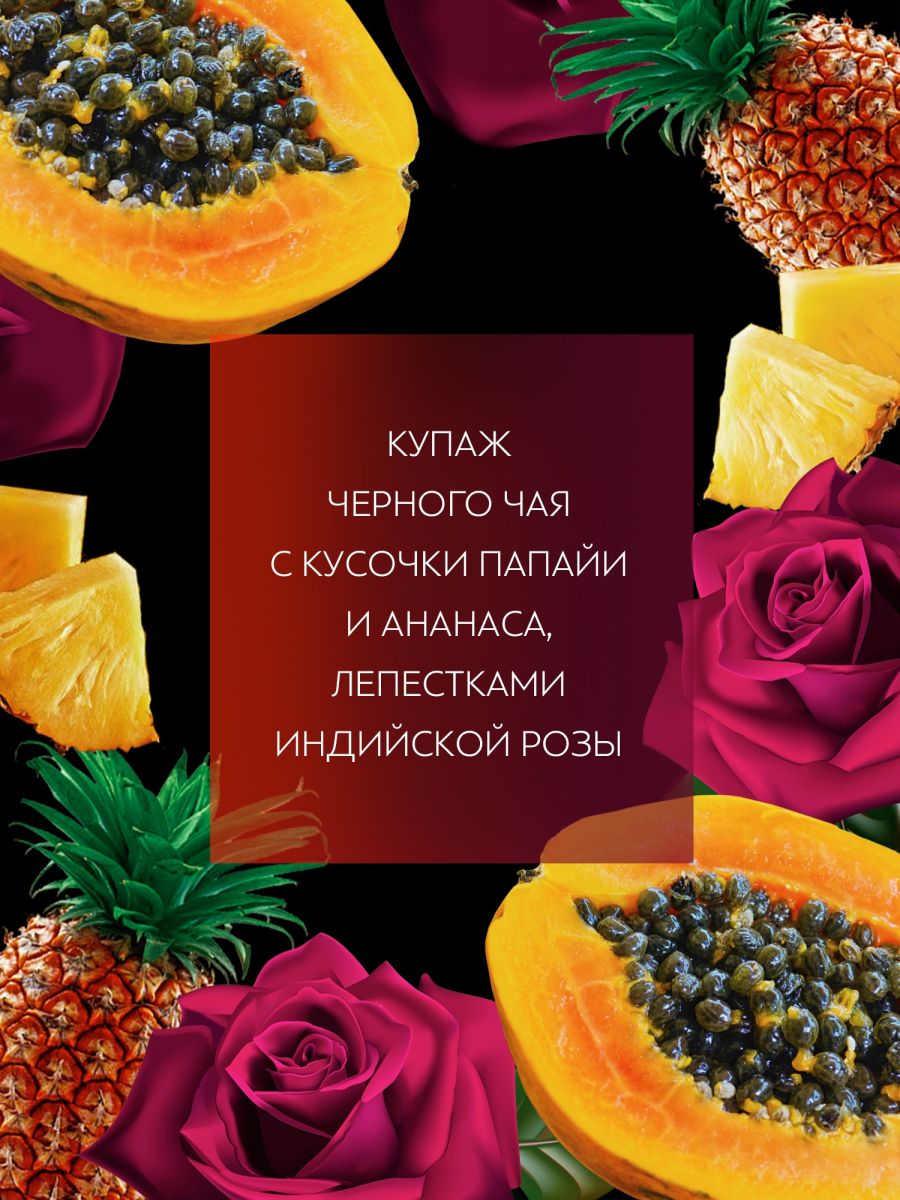 - Состав чёрный чай, папайя, ананас, лепестки розы красной, ароматизаторы.