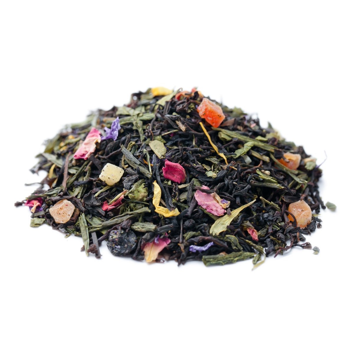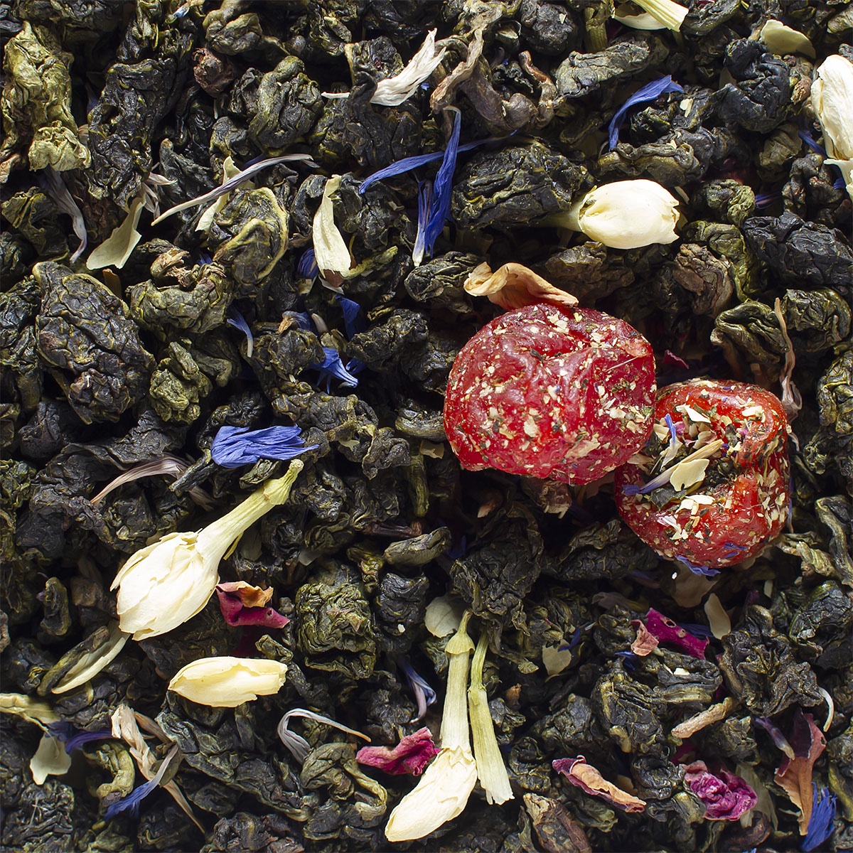 - Состав зеленый чай, лепестки василька и розы, цветы жасмина, вишня, ароматизатор "Карамель" и "Вишня".