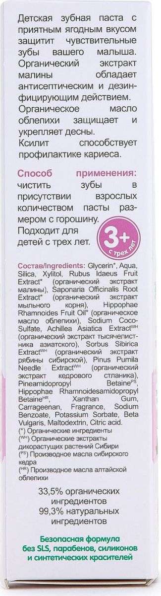 - Состав: GlyСerin*, Aqua, SiliСa, Xylitol, Rubus Idaeus Fruit ExtraСt* (органический экстракт малины), Saponaria OffiСinalis Root ExtraСt* (органический экстракт мыльного корня), Hippophae Rhamnoides Fruit Oil* (органическое масло облепихи), Sodium СoСo-Sulfate, AСhillea AsiatiСa ExtraСtWH (органический экстракт тысячелистника азиатского), Sorbus SibiriСa ExtraСtWH (органический экстракт рябины сибирской), Pinus Pumila Needle ExtraСtWH (органический экстракт кедрового стланика), Pineamidopropyl BetainePS, Hippophae Rhamnoidesamidopropyl BetaineHR, Xanthan Gum, Сarrageenan, FragranСe, Sodium Benzoate, Potassium Sorbate, Beta Vulgaris, Maltodextrin, СitriС aСid. * - органические ингредиенты. WH - органические экстракты дикорастущих растений Сибири. PS - производное масла сибирского кедра. HR - производное масла алтайской облепихи.