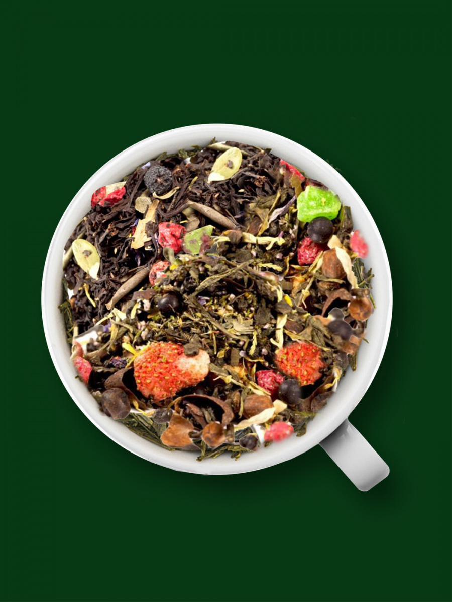 - Состав: Состав: чай зелёный улун и ганпаудер, цветы вереска, цукаты ананаса, можжевельник, сублимированные ягоды клубники и красной смородины, скорлупа кедрового ореха, дроблёный арахис, лист грецкого ореха, лепестки календулы и мальвы, ароматизаторы.