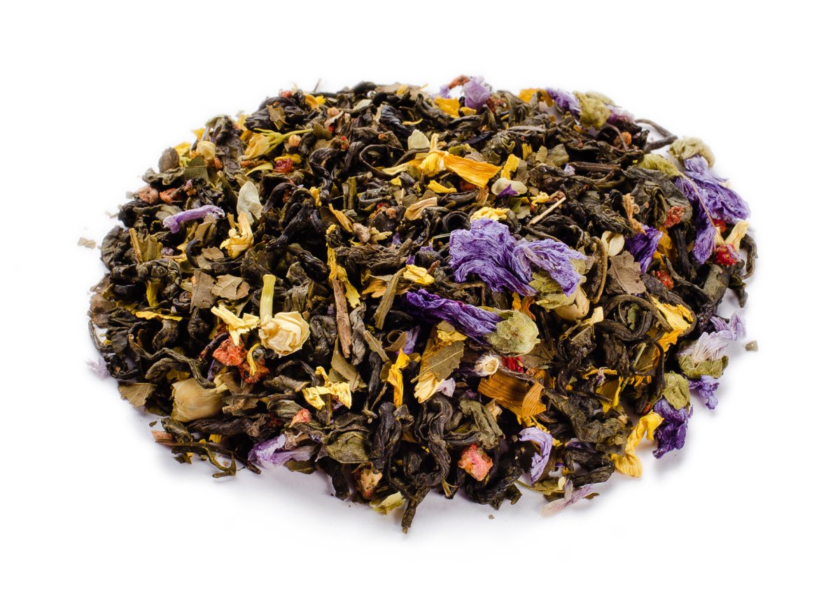 - Состав: чёрный чай, ароматизатор "Бергамот"., зелёный чай, цветы жасмина и мальвы, лепестки подсолнечника, красная смородина, кусочки и листья клубники, ароматизаторы "Манго" и "Клубника".