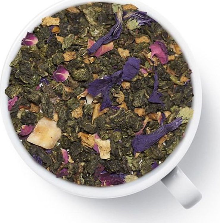 - Состав зелёный чай, лепестки красной розы, цветы мальвы, кубики папайи и яблока, ароматизаторы.