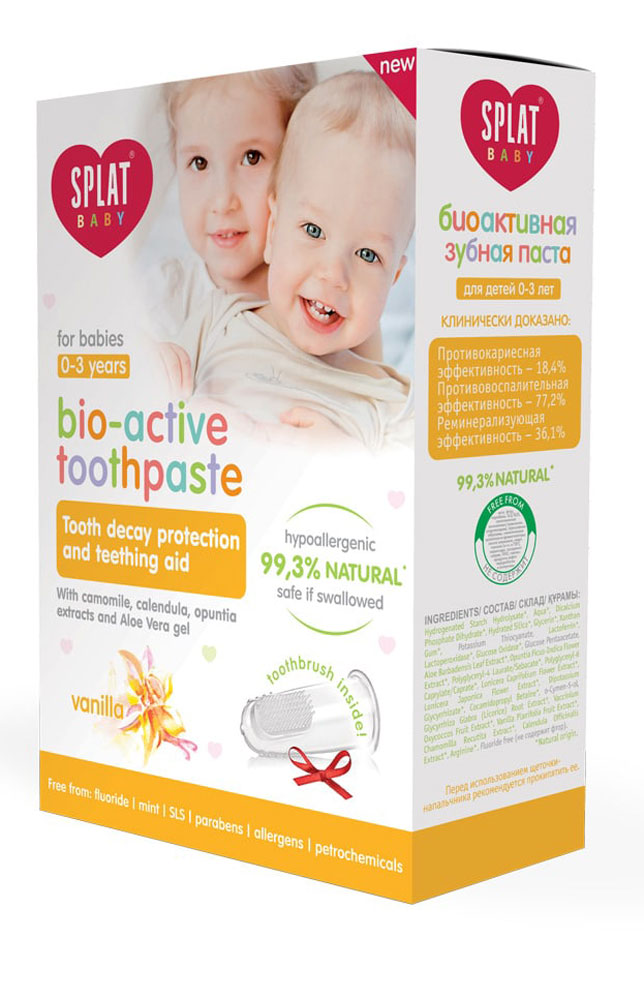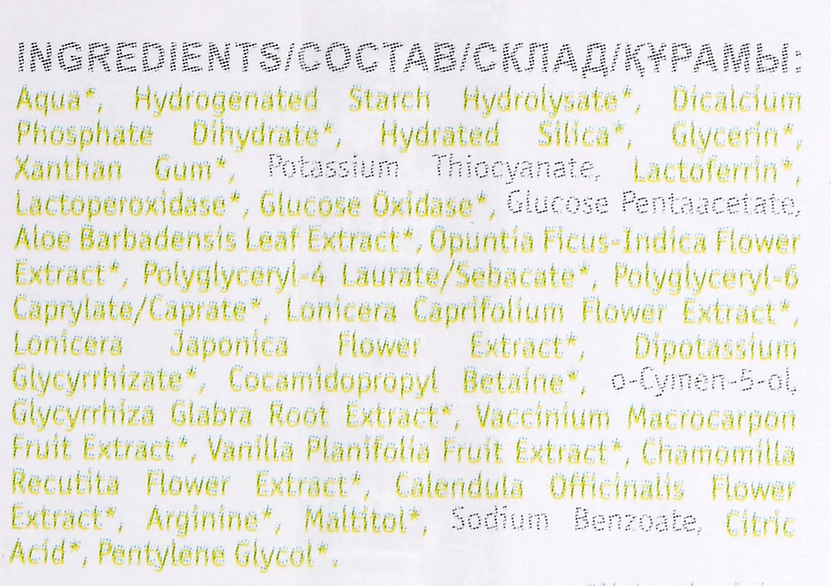 - Состав: Состав зубной пасты: Aqua*, Hydrogenated Starch Hydrolysate*, Dicalcium Phosphate Dihydrate*, Hydrated Silica*, Glycerin*, Xanthan Gum*, Potassium Thiocyanate, Lactoferrin*, Lactoperoxidase*, Glucose Oxidase*, Glucose Pentaacetate, Aloe Barbadensis Leaf Extract*, Opuntia Ficus-Indica Flower Extract*, Polyglyceryl-4 Laurate/Sebacate*, Polyglyceryl-6 Caprylate/Caprate*, Lonicera Caprifolium Flower Extract*, Lonicera Japonica Flower Extract*, Dipotassium Glycyrrhizate*, Cocamidopropyl Betaine*, o-Cymen-5-ol, Glycyrrhiza Glabra Root Extract*, Vaccinium Macrocarpon Fruit Extract*, Vanilla Planifolia Fruit Extract*, Chamomilla Recutita Flower Extract*, Calendula Officinalis Flower Extract*, Arginine*, Maltitol*, Sodium Benzoate, Citric Acid*, Pentylene Glycol*. Материал щетки – пищевой силикон. Мягкая щетина. *Natural origin.