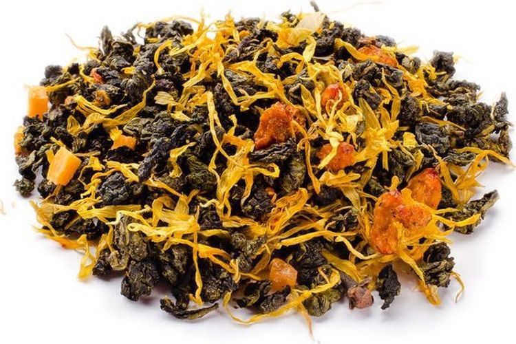 - Состав зеленый чай, ягоды облепихи, кусочки ананаса, лепестки календулы, гвоздика, ароматизатор "Облепиха".