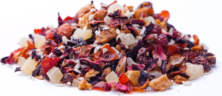 - Состав гибискус, кусочки яблока и ананаса, плоды шиповника, кокосовая стружка, ароматизаторы.
