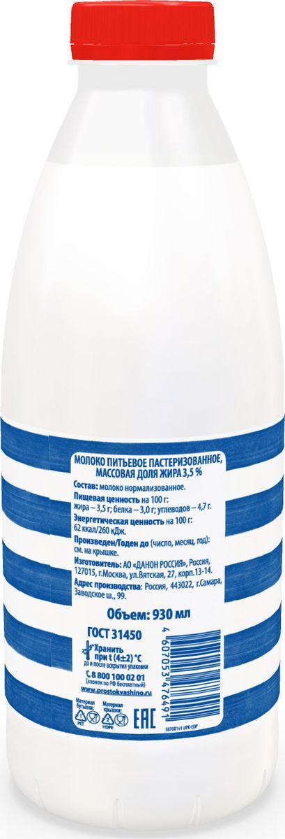 Простоквашино Молоко пастеризованное Отборное 3,4%-4,5%, 0,93 л