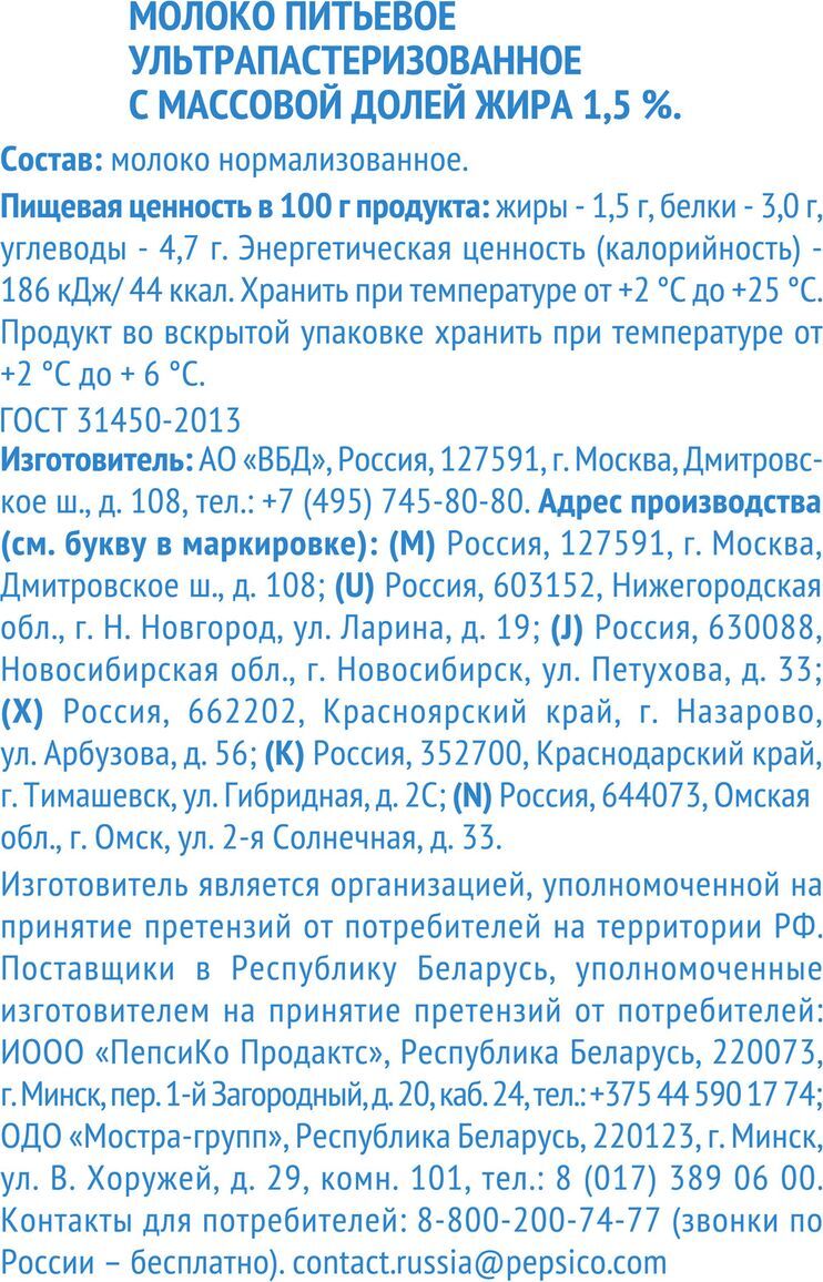 - Жирность, % 1.5