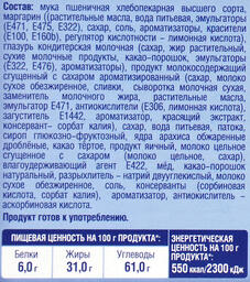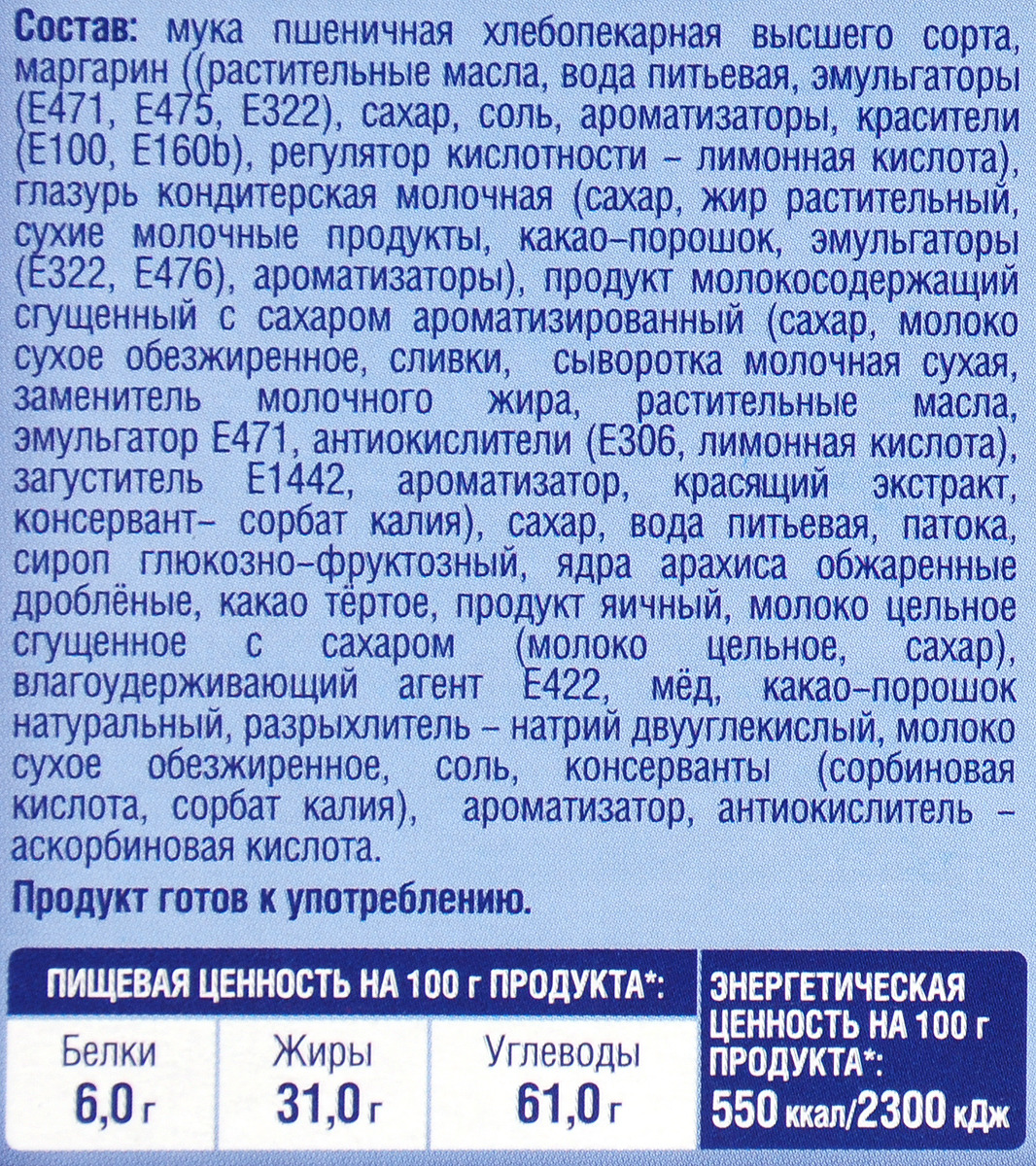 - Состав: Мука пшеничная хлебопекарная высшего сорта, маргарин ((рафинированные дезодорированные растительные масла в натуральном и модифицированом виде (модифицированное подсолнечное, пальмовое, кокосовое, подсолнечное, пальмоядровое), вода питьевая, эмульгаторы (Е471, Е475, Е332), сахар, консервант – сорбиновая кислота, соль, ароматизаторы, краситель – каротин, регулятор кислотности – лимонная кислота), глазурь кондитерская молочная (сахар, жир растительный лауриновый, сухие молочные продукты, какао-порошок, эмульгаторы (лецитин, эфиры полиглицерина и взаимоэтерифицированных рициноловых кислот), ароматизаторы), продукт молокосодержащий сгущенный с сахаром ароматизированный (сахар, молоко сухое обезжиренное, сливки, сыворотка молочная сухая, заменитель молочного жира (смесь дезодорированных масел – подсолнечное, пальмовое, эмульгатор Е471, антиокислитель Е306), крахмал кукурузный, ароматизатор, регулятор кислотности – лимонная кислота, красящий экстракт "Р6013 Экстракт сафлора", консервант – сорбат калия), сахар, вода питьевая, патока (солод ячменный, мука кукурузная, вода питьевая, сироп глюкозно-фруктозный, ядра арахиса обжаренные дробленые, какао тертое продукт яичный, продукт молокосодержащий сгущенный с сахаром с заменителем молочного жира (молоко цельное, молоко обезжиренное, сахар, сыворотка молочная, заменитель молочного жира, мальтодекстрин, ароматизатор, консерван – сорбат калия), влагоудерживающий агент – глицерин пищевой, мёд, какао-порошок, натуральный, разрыхлитель – натрий двууглекислый, молоко сухое обезжиренное, соль, консерванты ( сорбиновая кислота, сорбат калия), пищевой ароматизатор (специи, декстроза, целлюлоза, эфирные масла и олеорезины, масло растительное, ароматизаторы), антиокислитель – аскорбиновая кислота. Продукт может содержать незначительно количество орехов