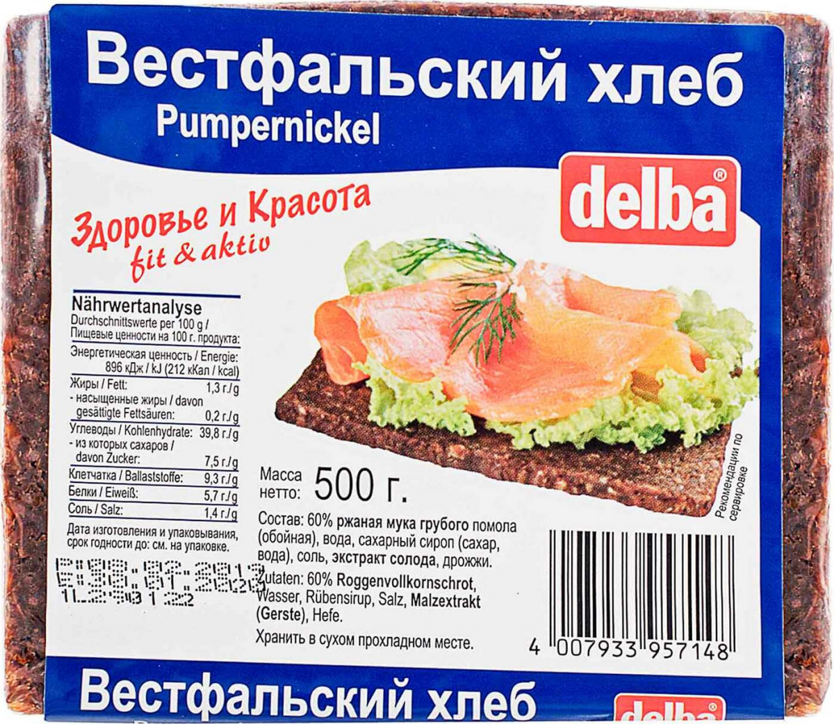 - Состав: Хлеб Delba вестфальский, 500 гр.Состав: 60% ржаная мука грубого помола (обойная), вода, сахарный сироп (сахар, вода), соль, экстракт солода, дрожжи.Не содержит ГМО.Пищевая и энергетическая ценность на 100г продукта: Энергетическая ценность: 896 кДж (212 ккал)Белки 5,7 грамма Жиры 1,3 граммаУглеводы 39,8 граммКлетчатка 9,3 граммаСоль: 1,2 граммаМасса нетто: 500 граммУсловия хранения: Хранить в сухом прохладном местеНе подвергать воздействию прямого солнечного светаСрок годности 11 месяцев