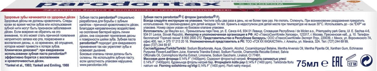 Способ применения:Чистите зубы 2 раза в день, но не более 3 раз. Не глотать. После чистки зубов необходимо прополоскать рот водой и сплюнуть. Не рекомендуется детям младше 14 лет. При длительном использовании проконсультируйтесь со стоматологом. В случае возникновения раздражения прекратите использование.