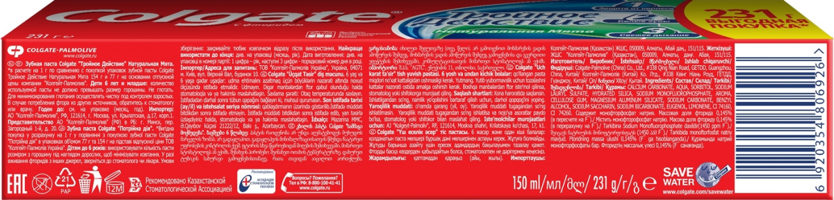 • Состав: Calcium Carbonate, Aqua, Sorbitol, Sodium Lauryl Sulfate, Hydrated Silica, Sodium Monofluorophosphate, Aroma, Cellulose Gu+BA35m, Magnesium Aluminum Silicate, Sodium Carbonate, Benzyl Alcohol, Sodium Saccharin, Sodium Bicarbonate, Limonene, Eugenol, Cl 74260, Cl 74160